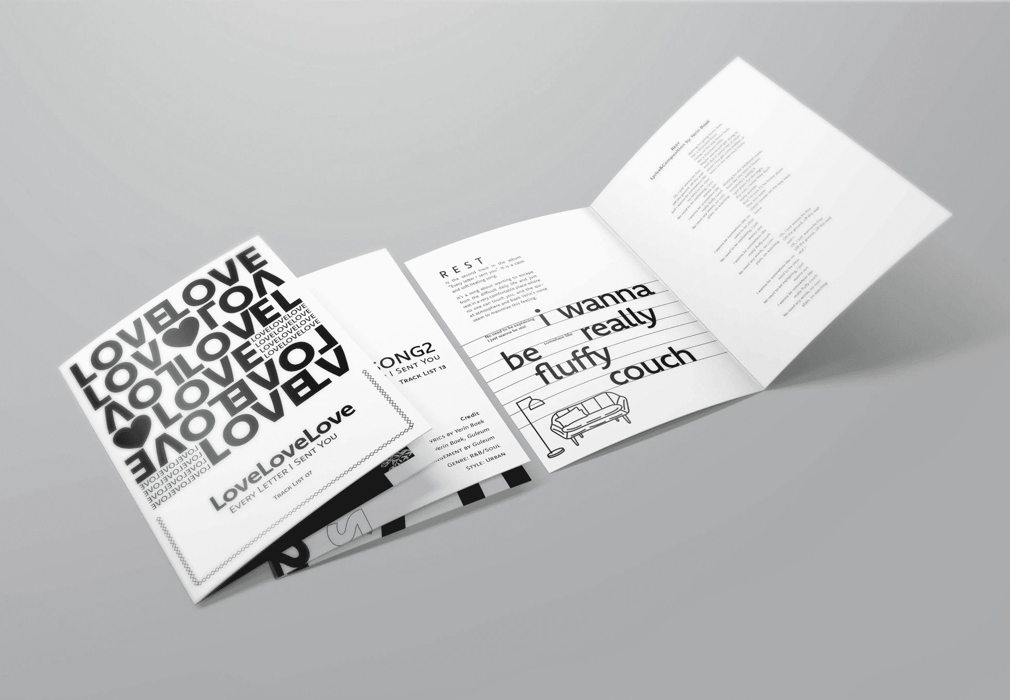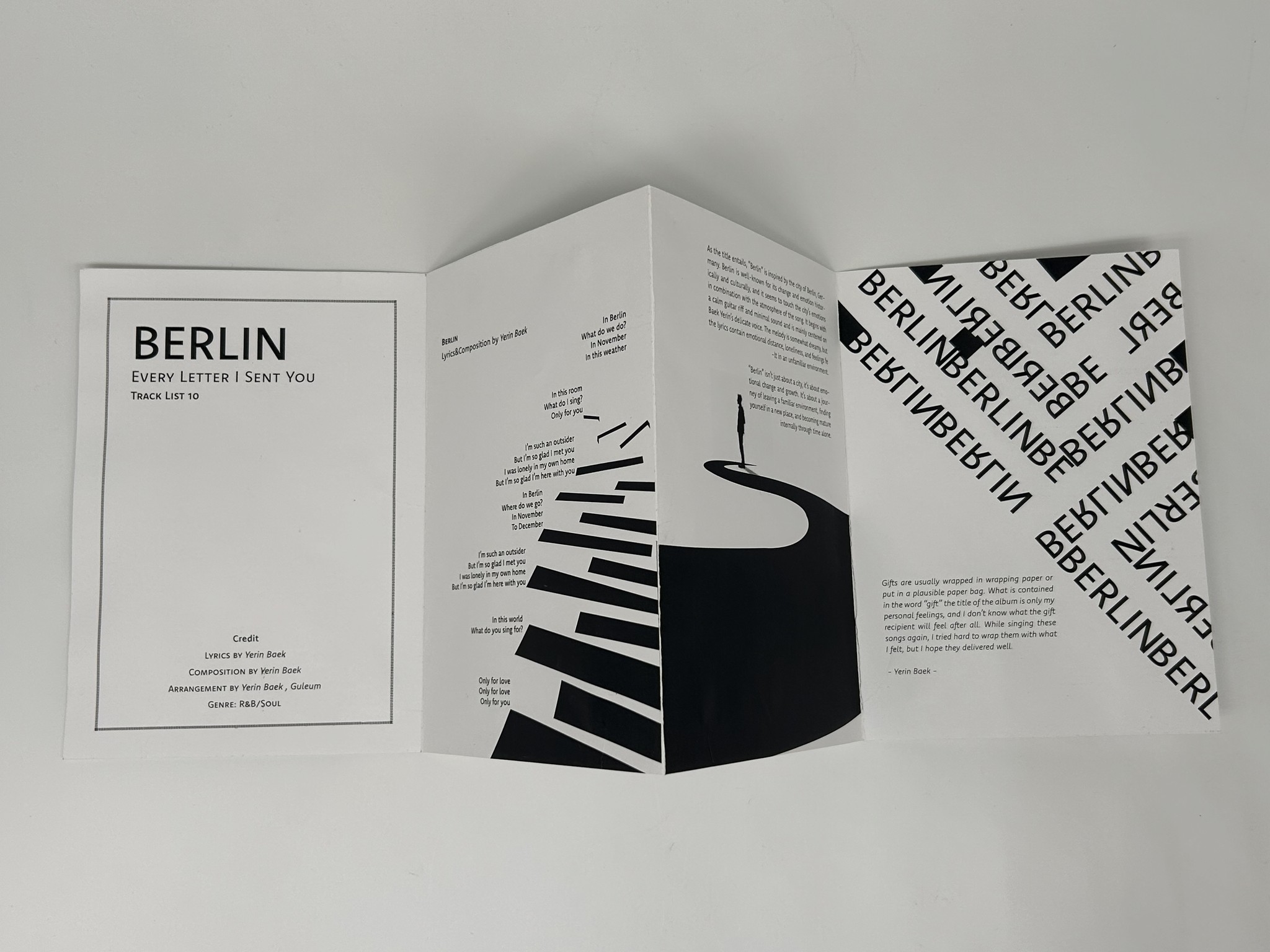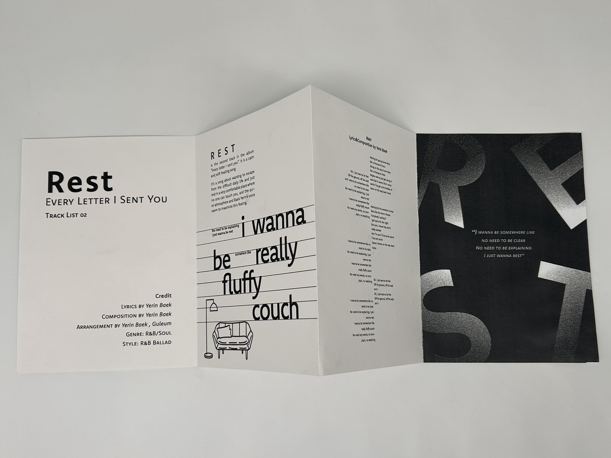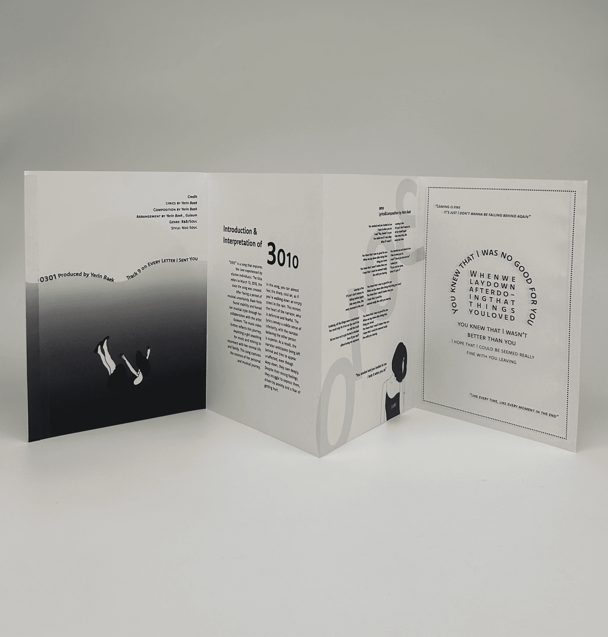 The artist I chose for this project is Yerin Baek, a 27 year-old Korean solo artist. I decided to recreate her first full length album, Every Letter I Sent You, as a songbook. I chose her because of her unique musical style. This album especially reflects that identity, as she wrote all the lyrics herself. Her voice carries both a cold and warm tone, and her songs maintain a calm, laid-back mood without many high notes. However, when reading the lyrics closely, her honest emotions are deeply revealed. For this project, I will design songbooks for tracks 2, 7, 9, 10, 15, and 17 out of the 18 songs on the album.