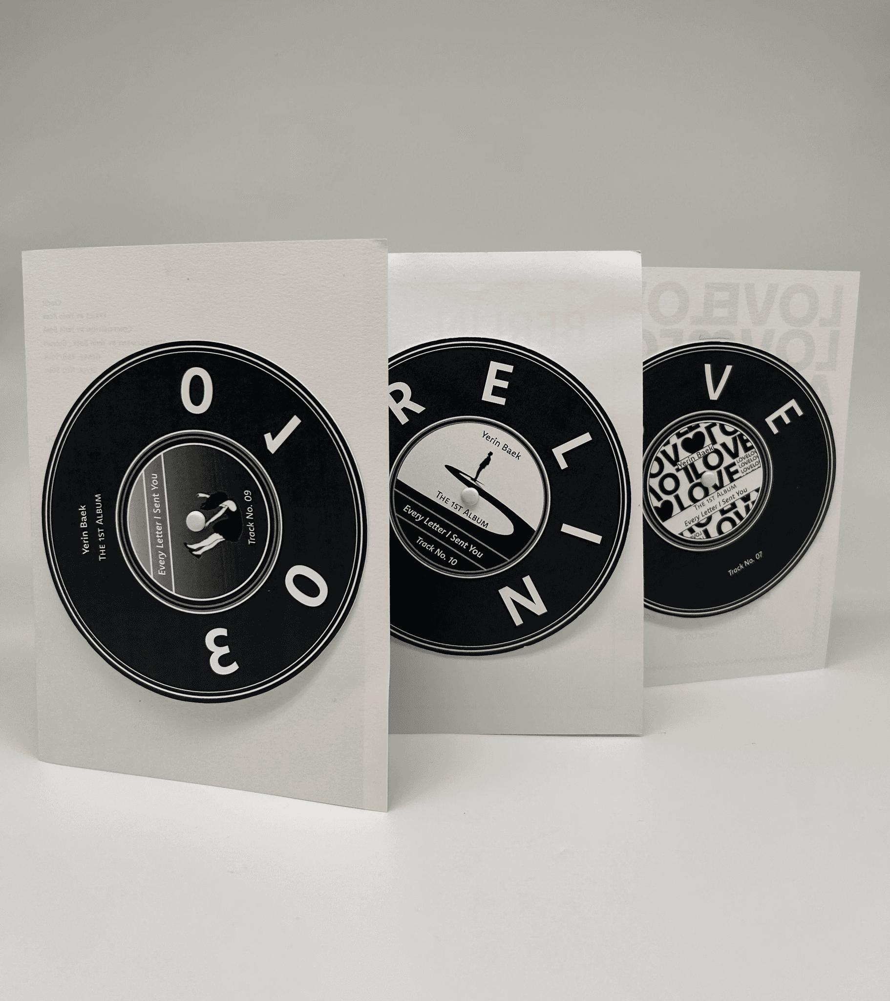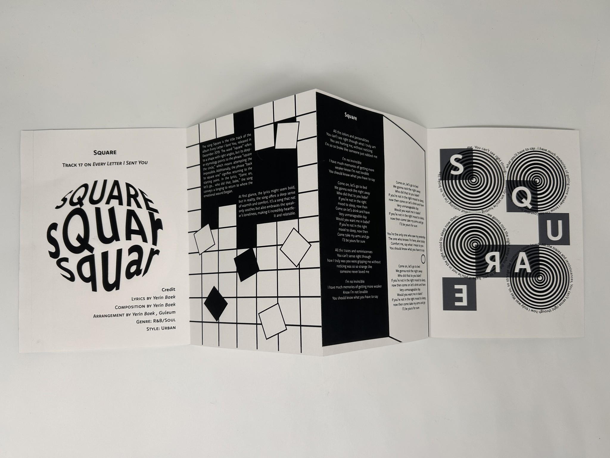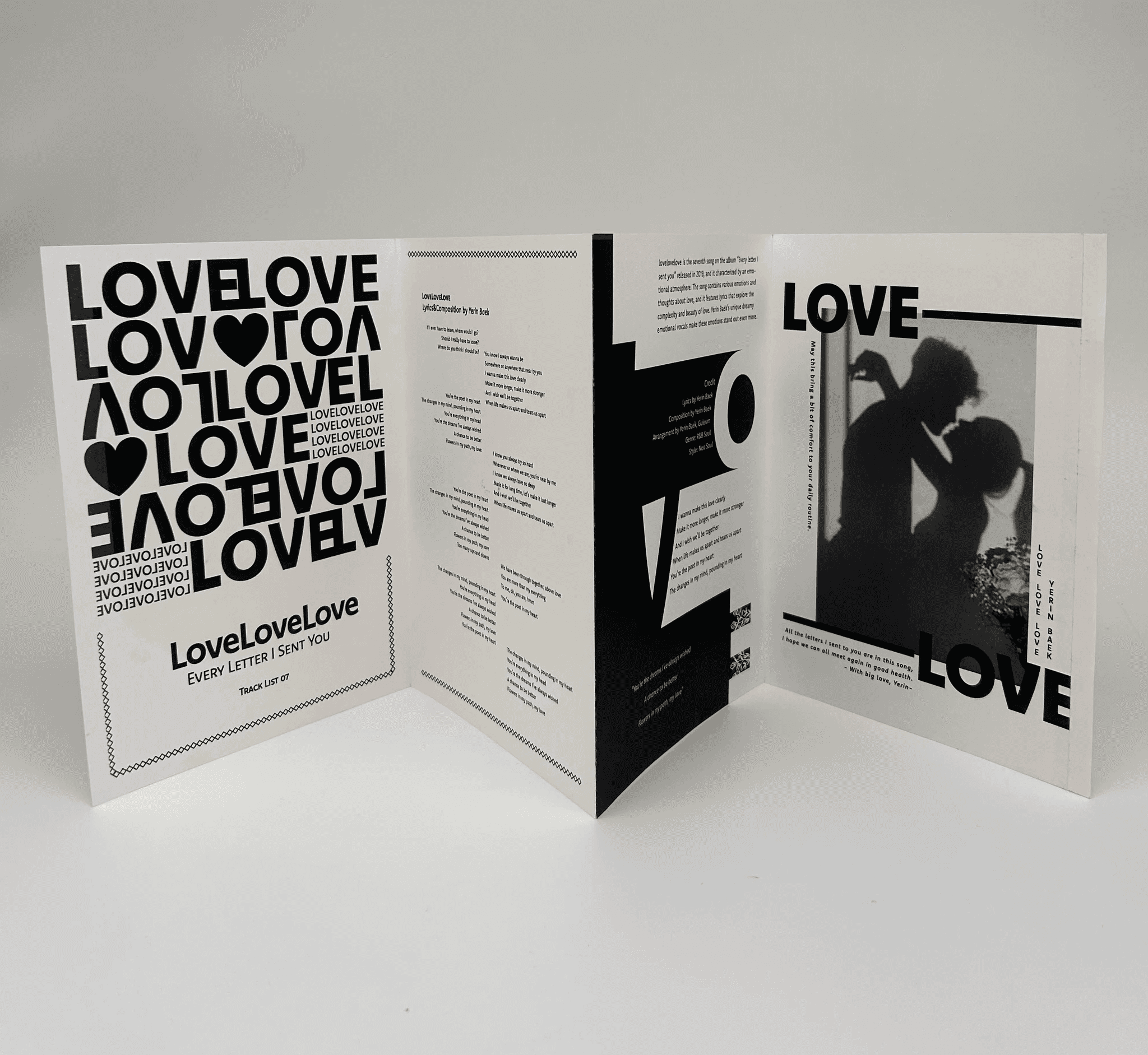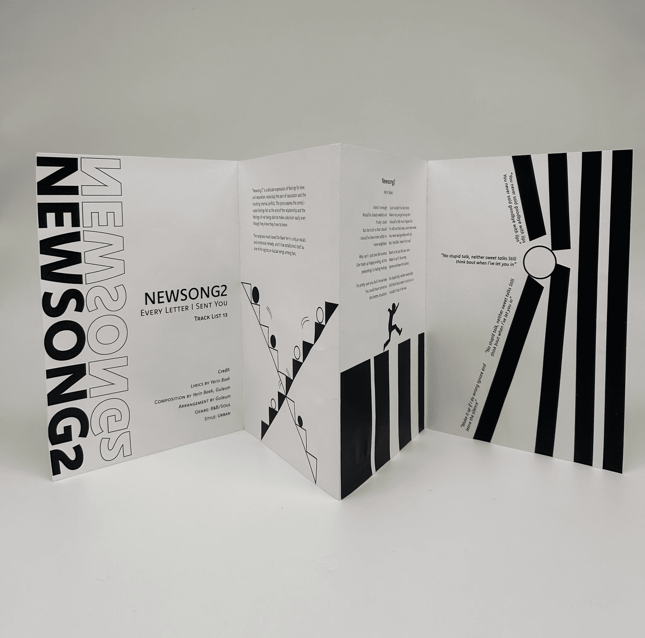 The artist I chose for this project is Yerin Baek, a 27 year-old Korean solo artist. I decided to recreate her first full length album, Every Letter I Sent You, as a songbook. I chose her because of her unique musical style. This album especially reflects that identity, as she wrote all the lyrics herself. Her voice carries both a cold and warm tone, and her songs maintain a calm, laid-back mood without many high notes. However, when reading the lyrics closely, her honest emotions are deeply revealed. For this project, I will design songbooks for tracks 2, 7, 9, 10, 15, and 17 out of the 18 songs on the album.